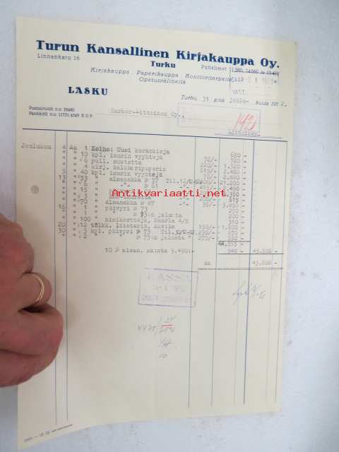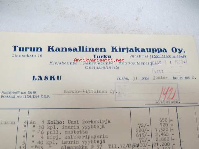 Turun Kansallinen Kirjakauppa Oy, Turku, 31.12.1952 -asiakirja / business document