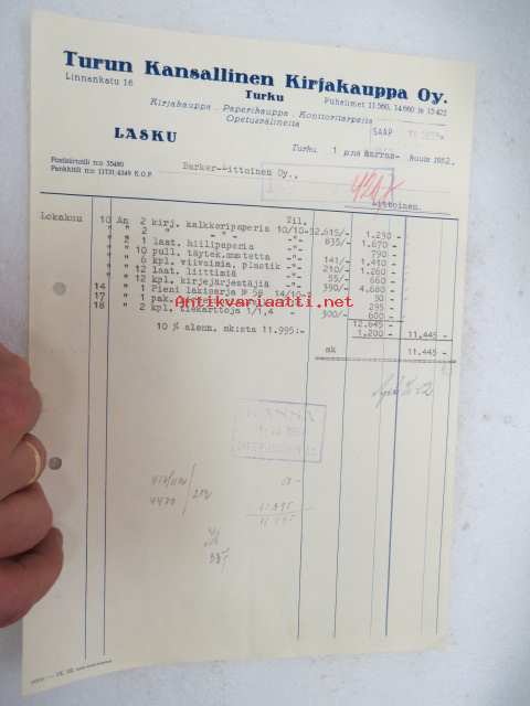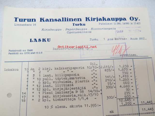 Turun Kansallinen Kirjakauppa Oy, Turku, 1.11.1952 -asiakirja / business document