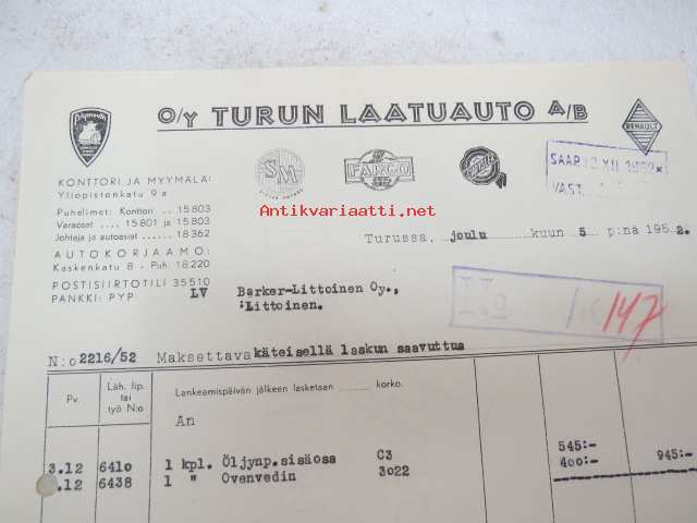 Oy Turun Laatuauto Ab (Plymouth, Singer, Fargo, Chrysler, Renault), Turku, 5.12.1952 -asiakirja / business document