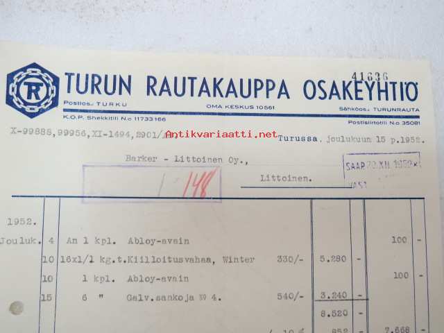 Turun Rautakauppa Oy, Turku, 15.12.1952 -asiakirja / business document