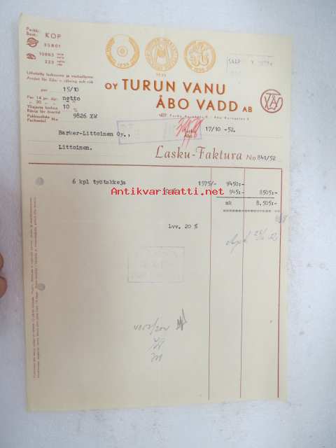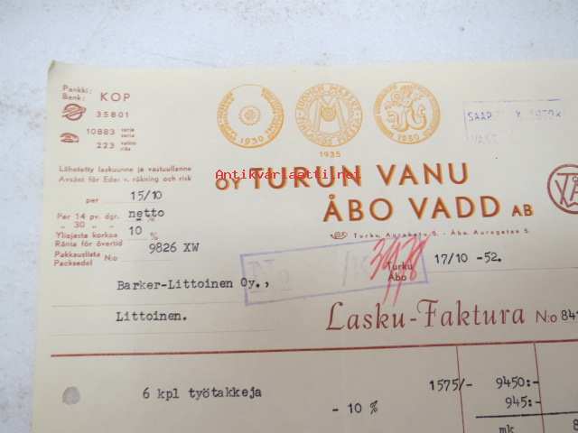 Oy Turun Vanu - Åbo VAdd Ab, Turku, 17.10.1952 -asiakirja / business document