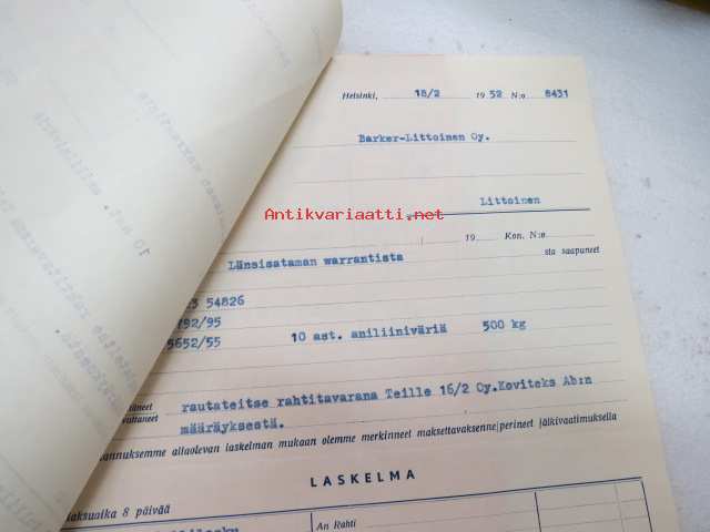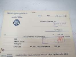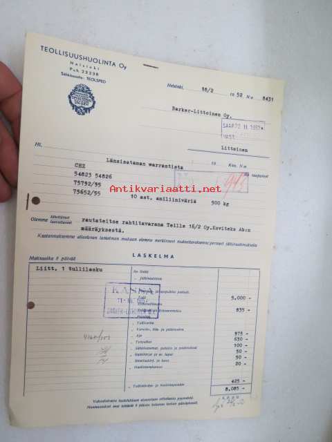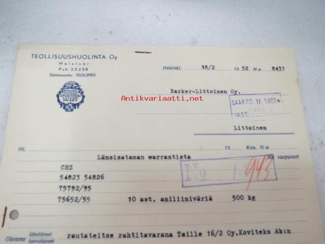 Teollisuushuolinta Oy, Helsinki, 18.2.1952 -asiakirja / business document