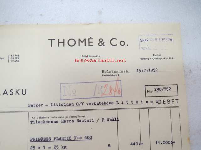 Thomé & Co, Helsinki, 15.7.1952 -asiakirja / business document