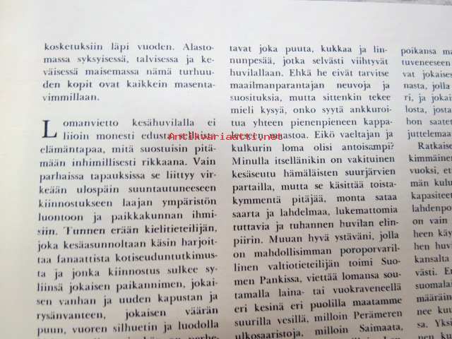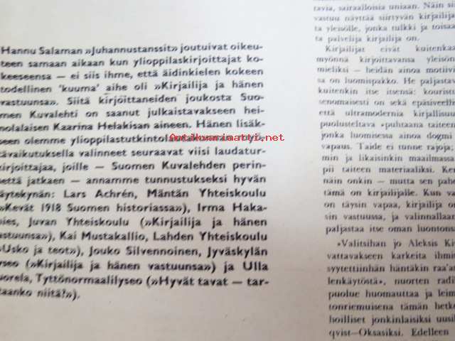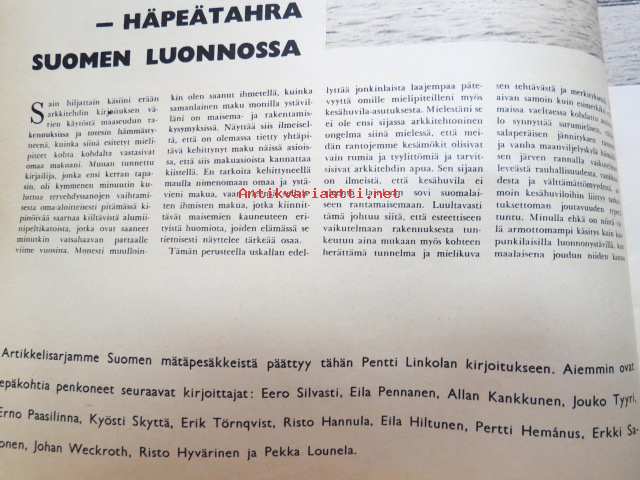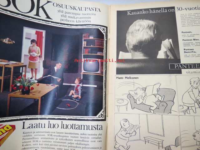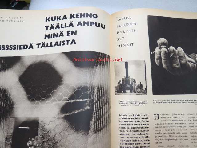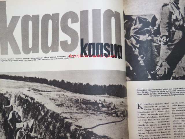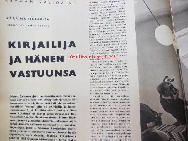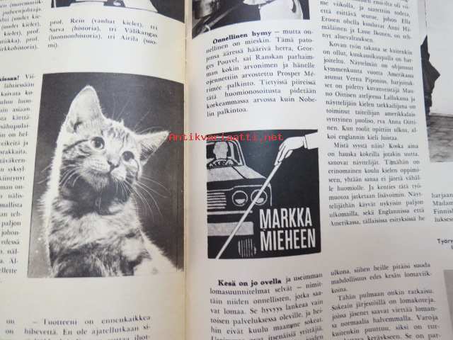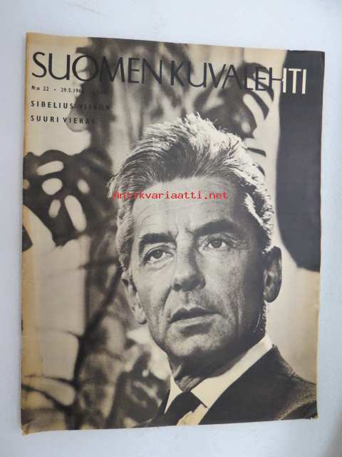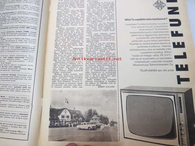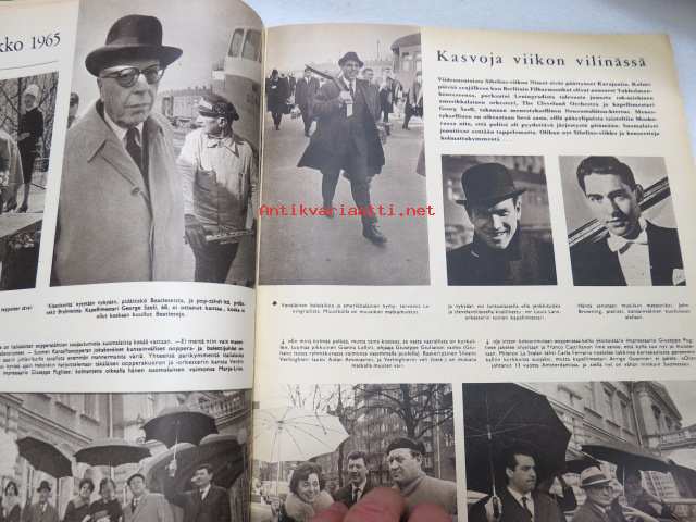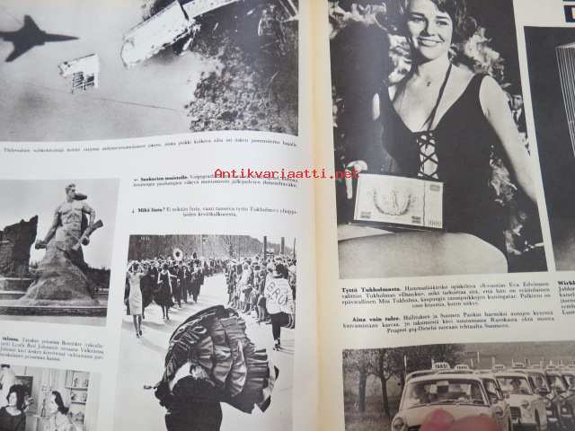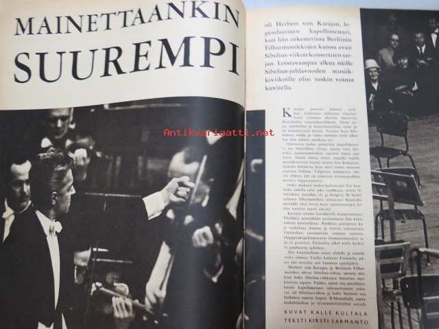 25 x 31 cm. Sisältää mm. seur. artikkelit / kuvat / mainokset; Kansikuva Herbert von Karajan - Sibeliusviikon suuri vieras, Jugoslavialaisen professori Mihailovin Neuvostoliitto -aiheisista kirjoituksista vankeutta, Museokapineet lähtivät liikkeelle - rakkaus vanhoihin autoihin ulkomailla, Pentti Linkola - Huvilaslummit - häpeätahra Suomen luonnossa (kirjoitussarjassa "Mikä mättää Suomessa"), Kevään valioaine - Kaarina Helakisa (Heinolan yhteislyseo) - Kirjailija ja hänen vastuunsa - Hannu Salama ja Juhannustanssit-kirja, Raippaluodon poliittiset minkit, ym.