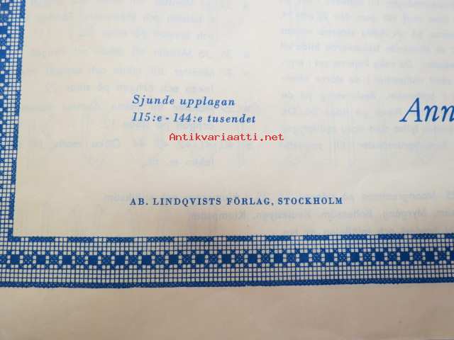 | Saatavilla | 1 kpl | | Sivuja | 38 | | Painos | 7. | | Kunto | K2 | | Kulunut | | Sidonta/painoasu | Nidottu (pehmeäk.) | | Kielet | Ruotsi |