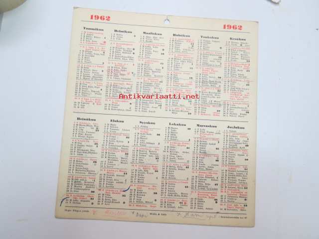 Seinäkalenteri / seinäalmanakka 1962 -wall calendar