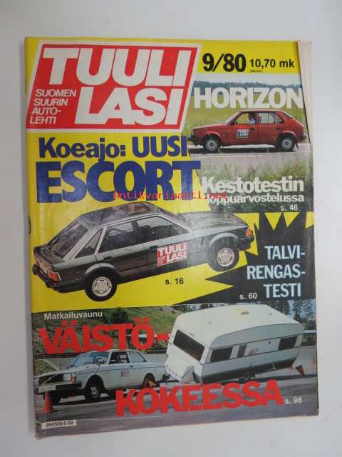 Tuulilasi 1980 nr 9, sisältää mm. seur. artikkelit / kuvat / mainokset; Koeajo uusi Ford Escort, Horizon kestotestin loppuarvostelu, Matkailuvaunu väistökokeessa ym.