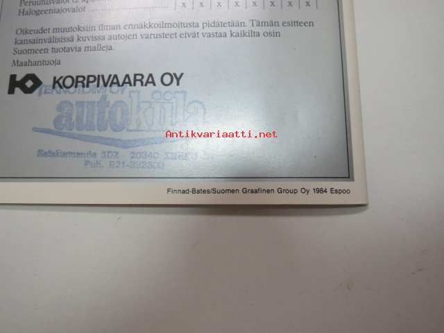 | Saatavilla | 1 kpl | | Julkaisuvuosi | 1984 | | Sivuja | 16 | | Kunto | K3 | | Sidonta/painoasu | Nidottu (pehmeäk.) | | Kielet | Suomi |