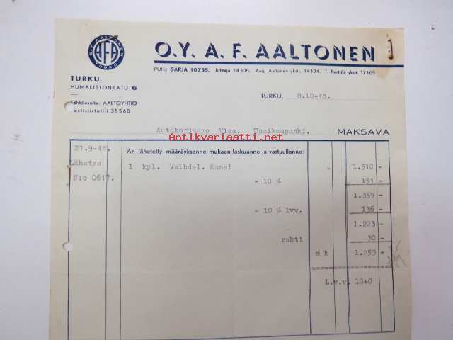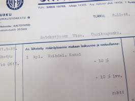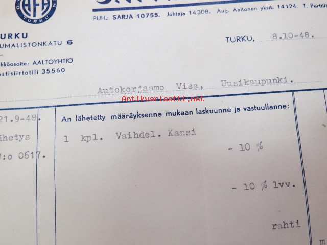 Oy A.F. Aaltonen, Turku 8.10.1948 - Autokoulu ja autokorjaamo Visa, Uusikaupunki -asiakirja / business document