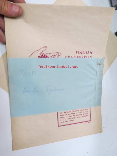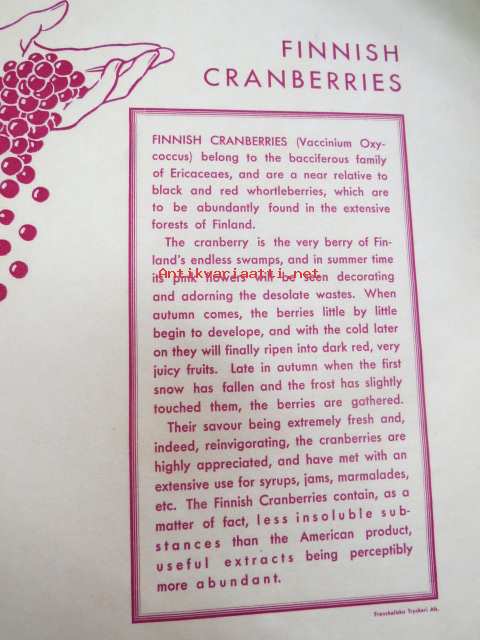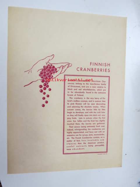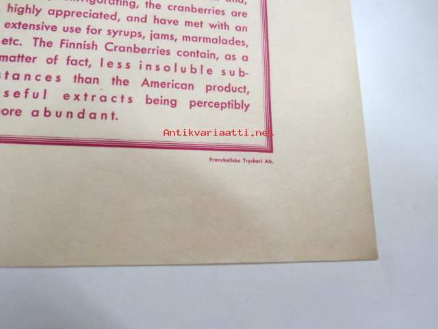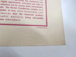 Finnish cranberries (Vaccinium Oxycoccus) -marjanviejän (forstmästare Ingman) pakkausetiketti, painettu 14.10.1933 (Frenckell) -label