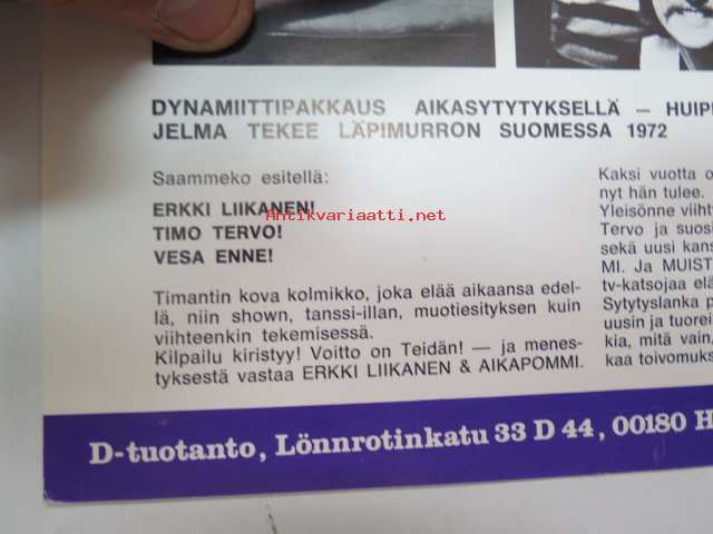 D-Tuotanto tarjoaa - Erkki Liikanen & aikapommi -Dannyn (Ilkka Lipsanen) D-Tuotannon "talliin" kuuluneen artistin esite (harvinaisia, ei jaettu yleisölle