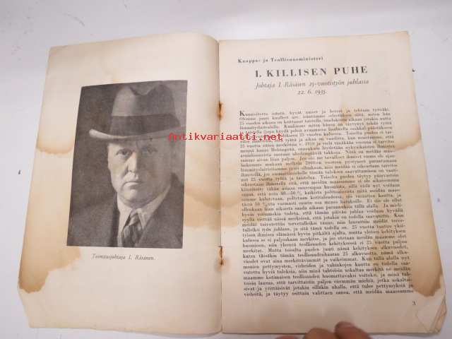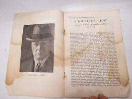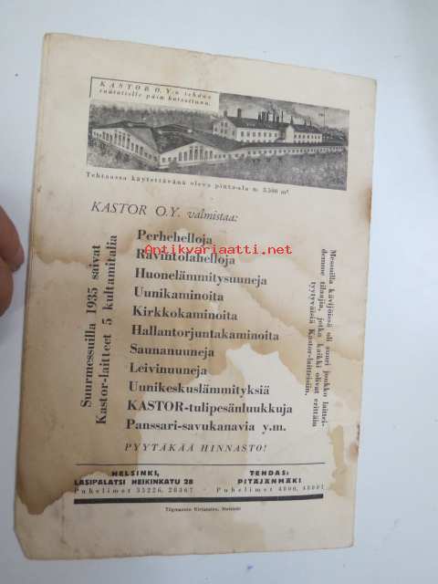 | Saatavilla | 1 kpl | | Julkaisuvuosi | 1935 | | Sivuja | 16 | | Kunto | K2 | | Kulunut ja vaurioitunut | | Sidonta/painoasu | Pienpainate | | Kielet | Suomi |