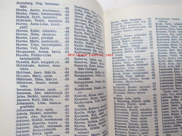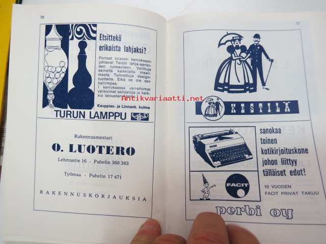 | Saatavilla | 1 kpl | | Julkaisuvuosi | 1969 | | Sivuja | 124 | | Painos | 1. | | Kunto | K3 | | Sidonta/painoasu | Nidottu (pehmeäk.) | | Kielet | Suomi |