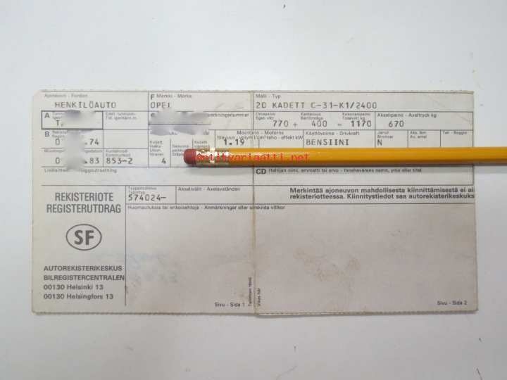 Opel Kadett 2D C-31-K1/2400 -rekisteriote / registration card