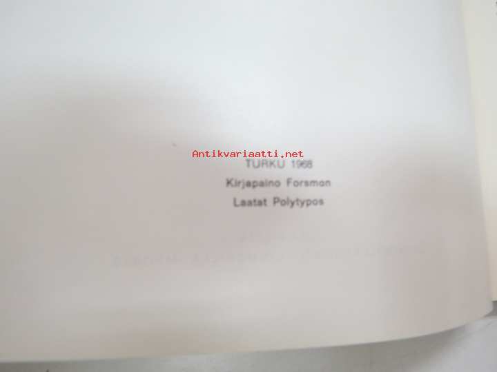 | Saatavilla | 1 kpl | | Julkaisuvuosi | 1968 | | Sivuja | 80 | | Painos | 1. | | Kunto | K3 | | Sidonta/painoasu | Sidottu (kovak.) | | Kielet | Suomi |