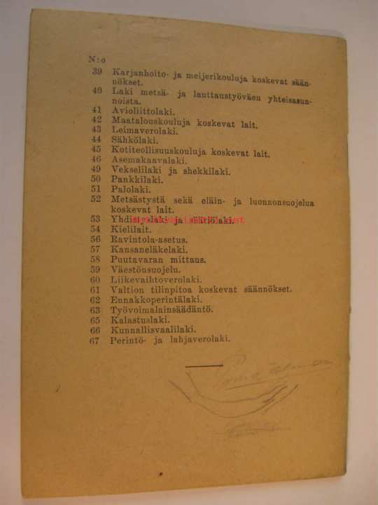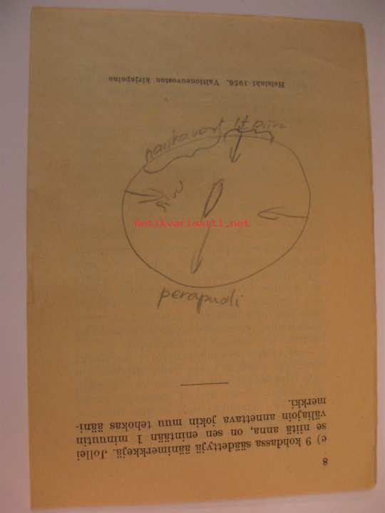| Saatavilla | 1 kpl | | Julkaisuvuosi | 1954 | | Sivuja | 58+8 | | Kunto | K3 | | lyijykynätekstejä | | Sidonta/painoasu | Nidottu (pehmeäk.) | | Kielet | Suomi |