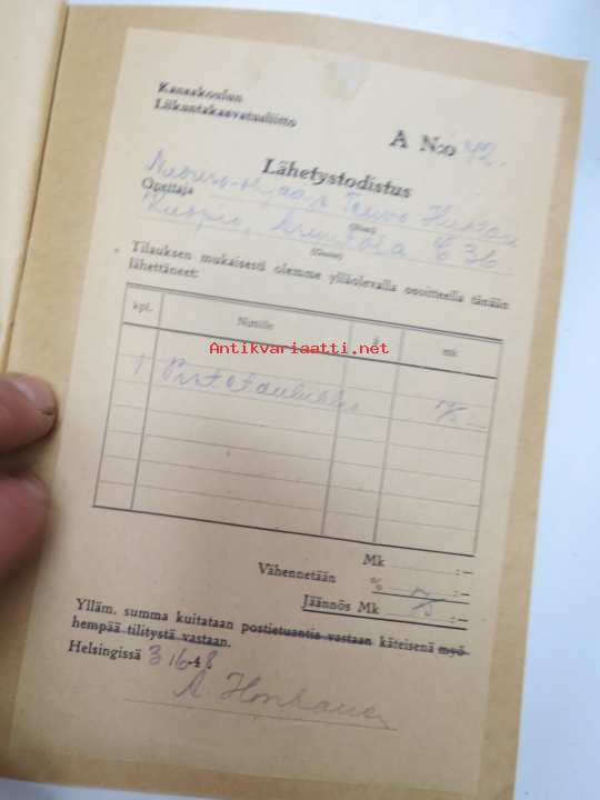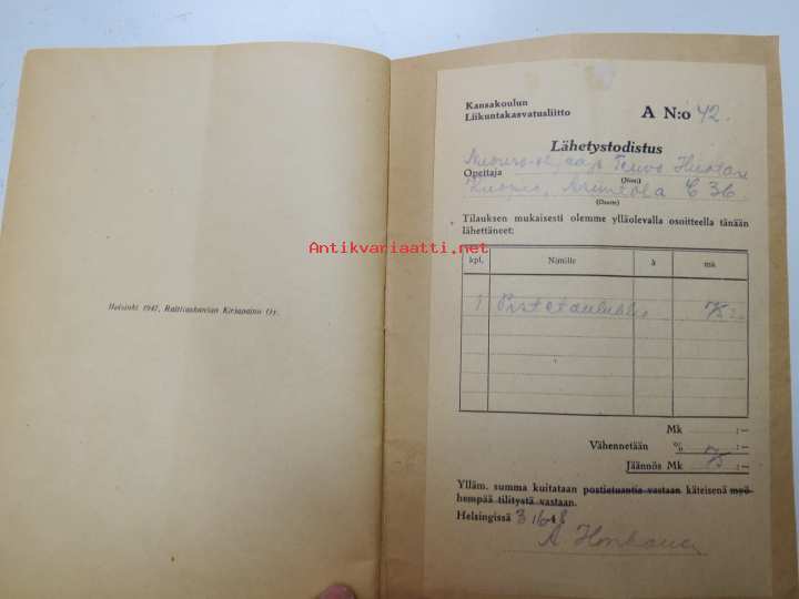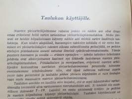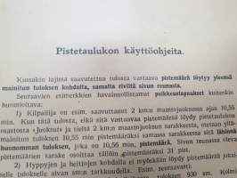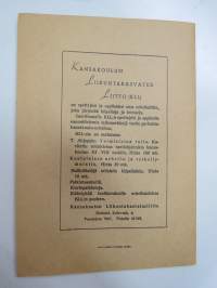 | Saatavilla | 1 kpl | | Julkaisuvuosi | 1947 | | Sivuja | 39 | | Painos | 1. | | Kunto | K3 | | Sidonta/painoasu | Nidottu (pehmeäk.) | | Kielet | Suomi |