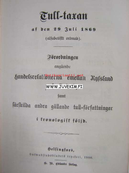 | Saatavilla | 1 kpl | | Julkaisuvuosi | 1880 | | Sivuja | 246 | | Kunto | K3 | | Sidonta/painoasu | Sidottu (kovak.) | | Kielet | Ruotsi |