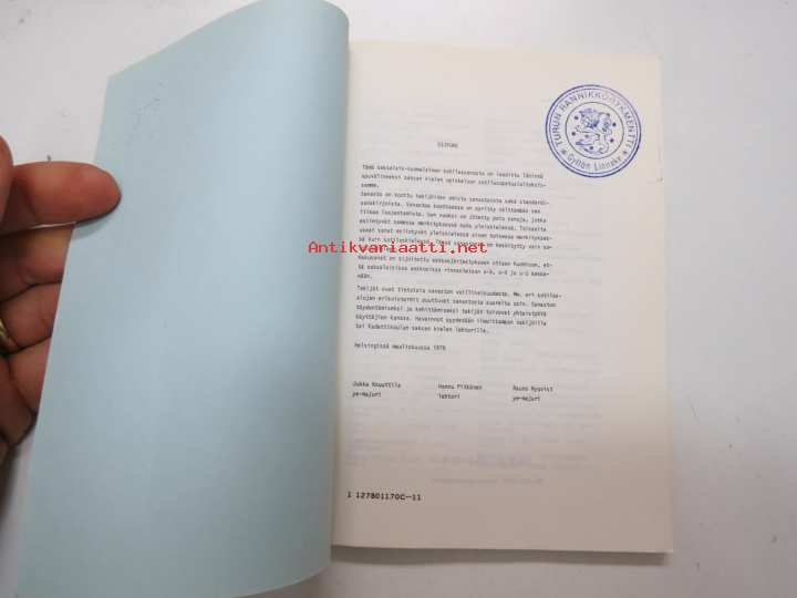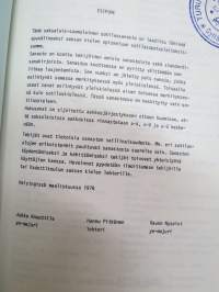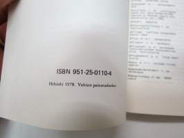 | Saatavilla | 1 kpl | | Julkaisuvuosi | 1978 | | Sivuja | 111 | | Painos | 1. | | Kunto | K3 | | Sidonta/painoasu | Nidottu (pehmeäk.) | | ISBN | 951-25-0110-4 | | Kielet | Suomi, Saksa |