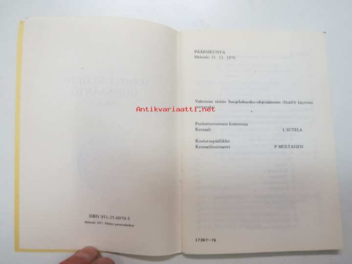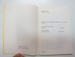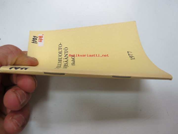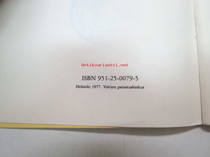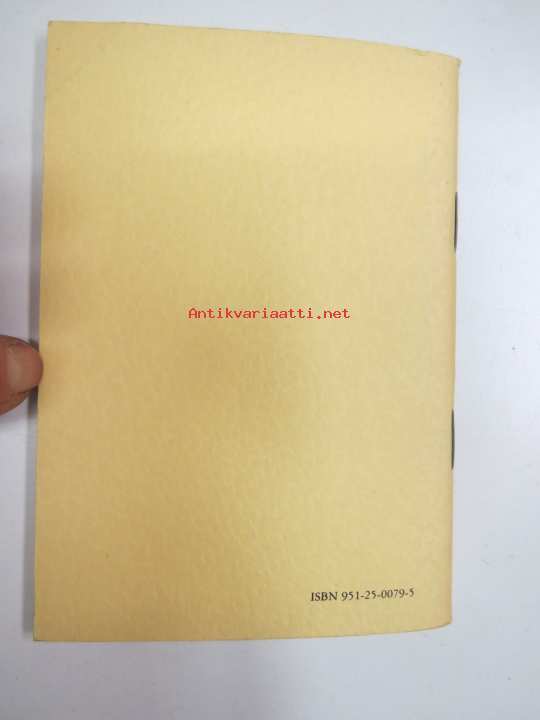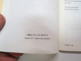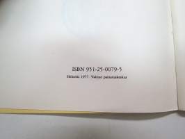 | Saatavilla | 1 kpl | | Julkaisuvuosi | 1977 | | Sivuja | 77 | | Painos | 1. | | Kunto | K2 | | Sidonta/painoasu | Nidottu (pehmeäk.) | | Kielet | Suomi |