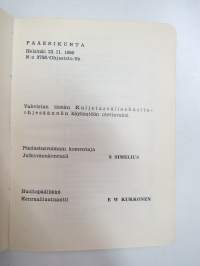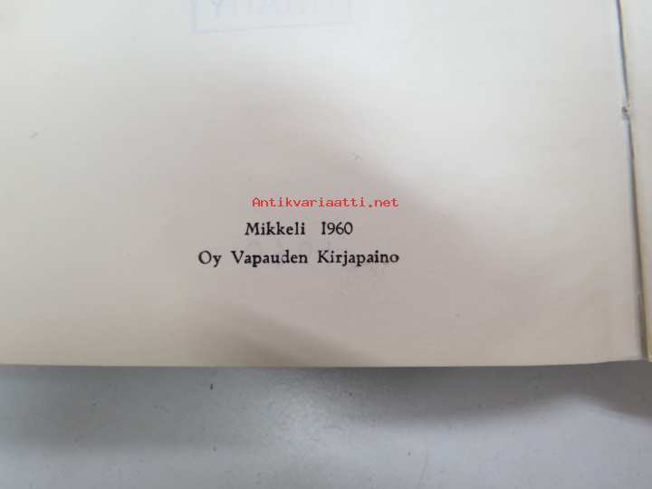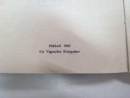 | Saatavilla | 1 kpl | | Julkaisuvuosi | 1960 | | Sivuja | 183 | | Painos | 1. | | Kunto | K3 | | Sidonta/painoasu | Sidottu (kovak.) | | Kielet | Suomi |