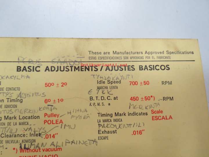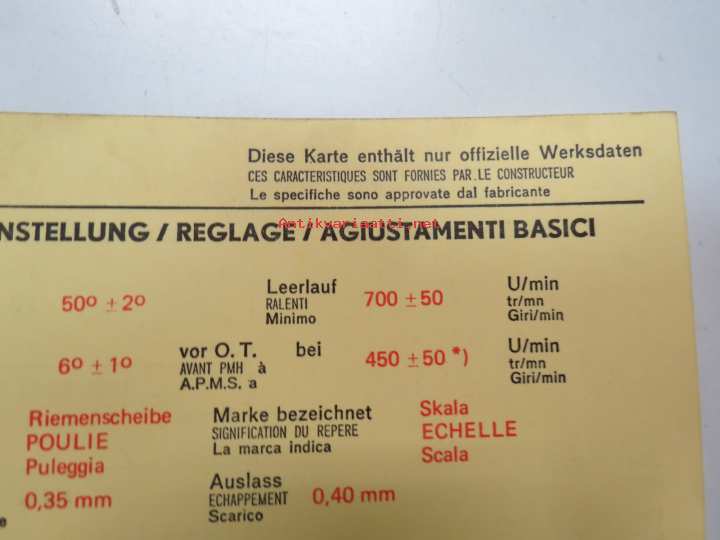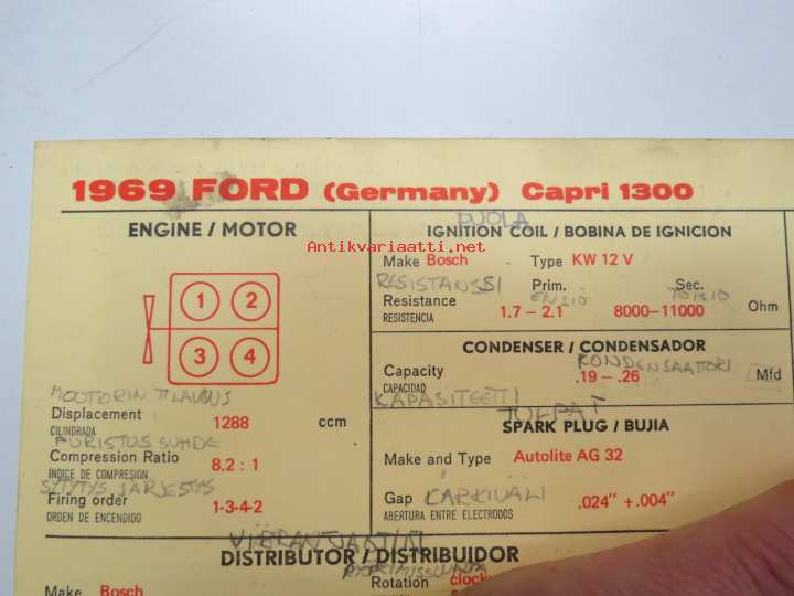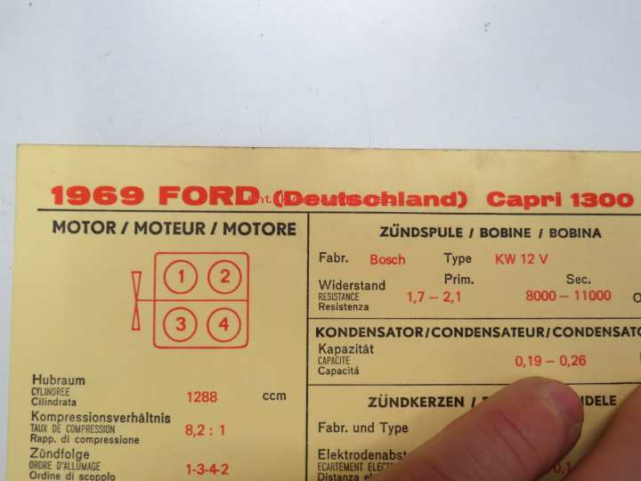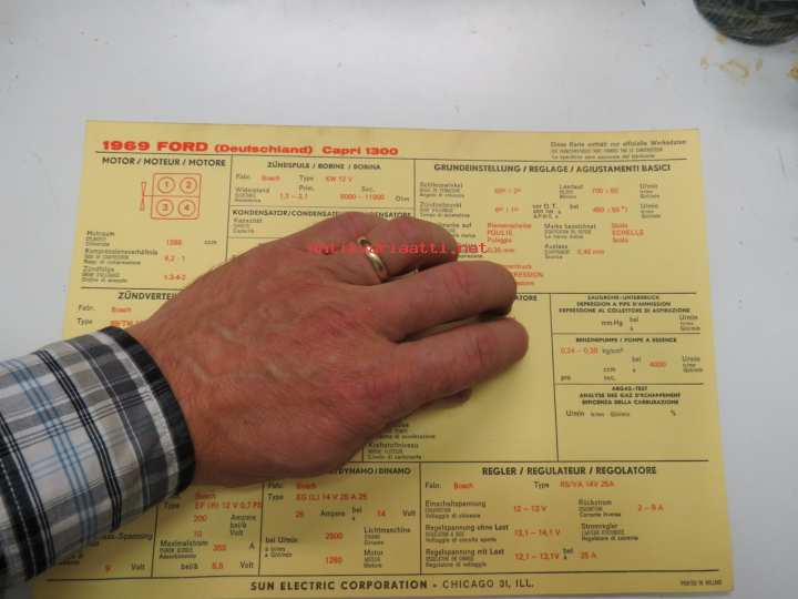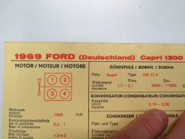 Ford Capri 1300 1969 (Germany) - Sun Electric Corporation -säätöarvokortti, monikielinen - englanti - espanja - saksa - ranska - Technical specifications card