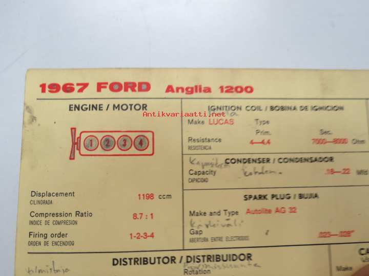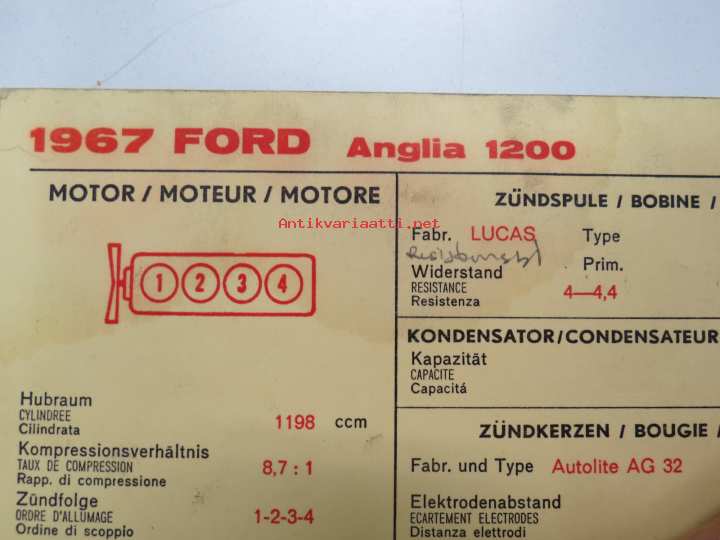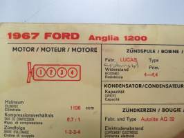 Ford Anglia 1200 1967 Sun Electric Corporation -säätöarvokortti, monikielinen - englanti - espanja - saksa - ranska - Technical specifications card