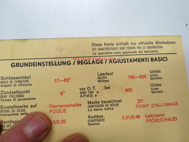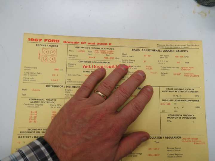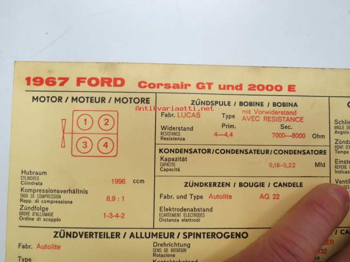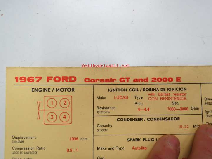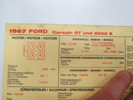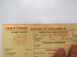 Ford Corsair GT and 2000 E 1967 Sun Electric Corporation -säätöarvokortti, monikielinen - englanti - espanja - saksa - ranska - Technical specifications card