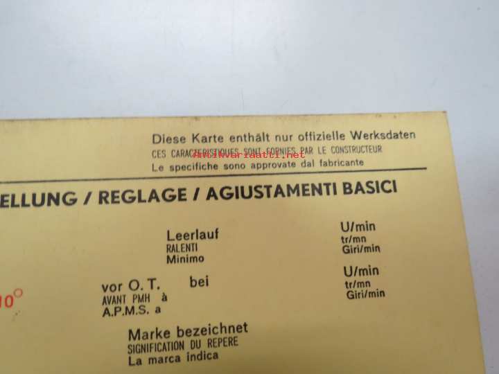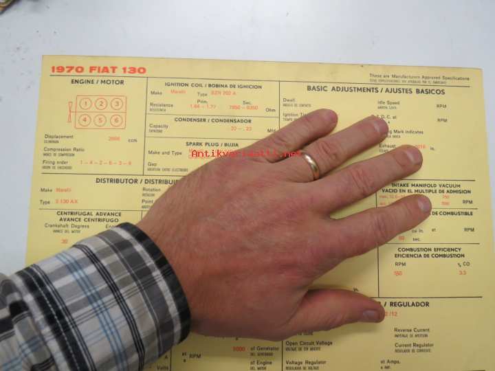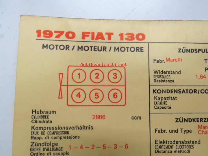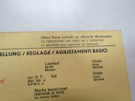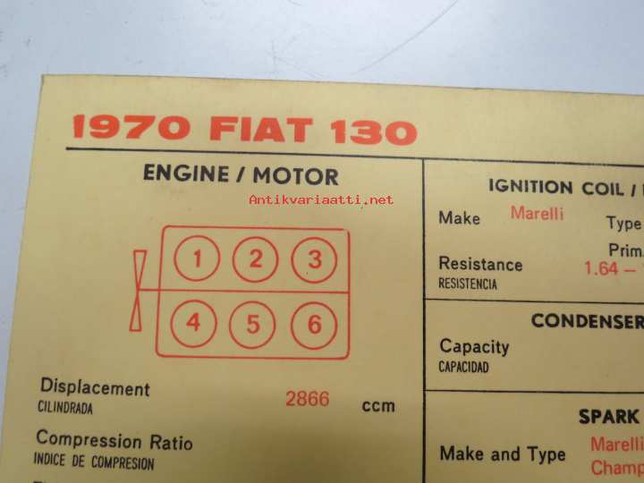 Fiat 130 1970 Sun Electric Corporation -säätöarvokortti, monikielinen - englanti - espanja - saksa - ranska -Technical specifications card
