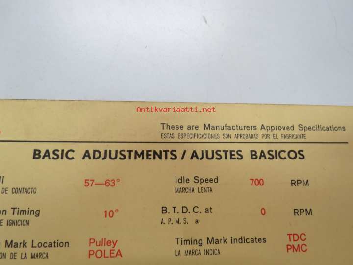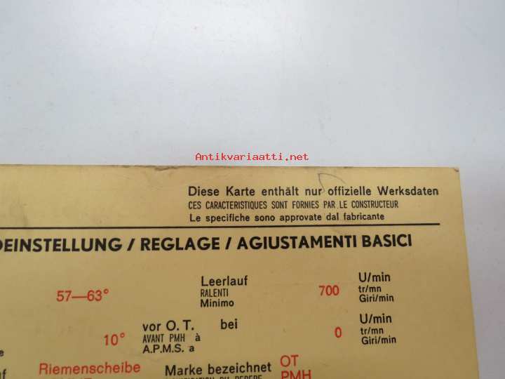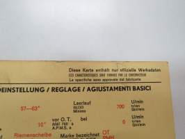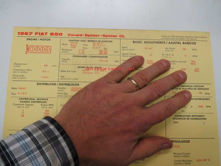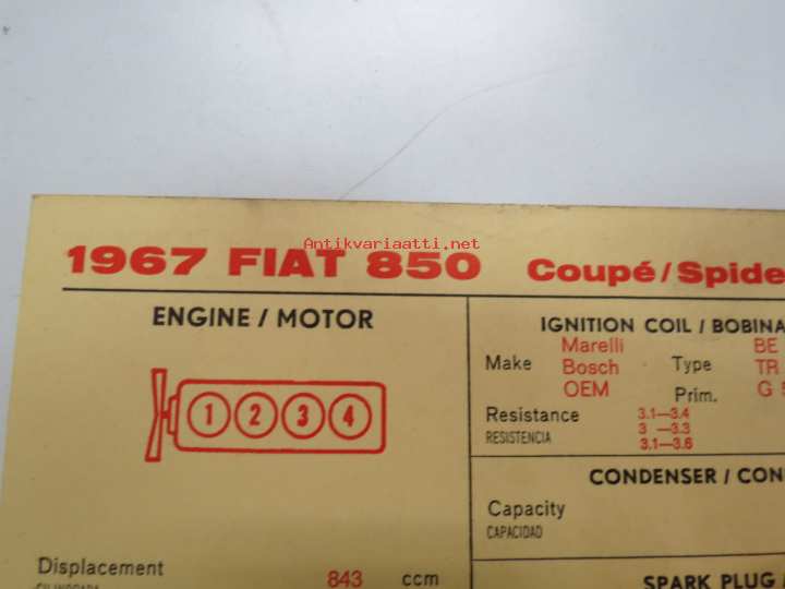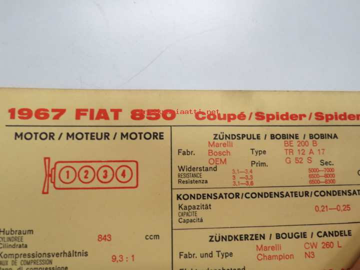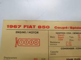 Fiat 850 1967 Coupé / Spider / Spider CL Sun Electric Corporation -säätöarvokortti, monikielinen - englanti - espanja - saksa - ranska -Technical specifications