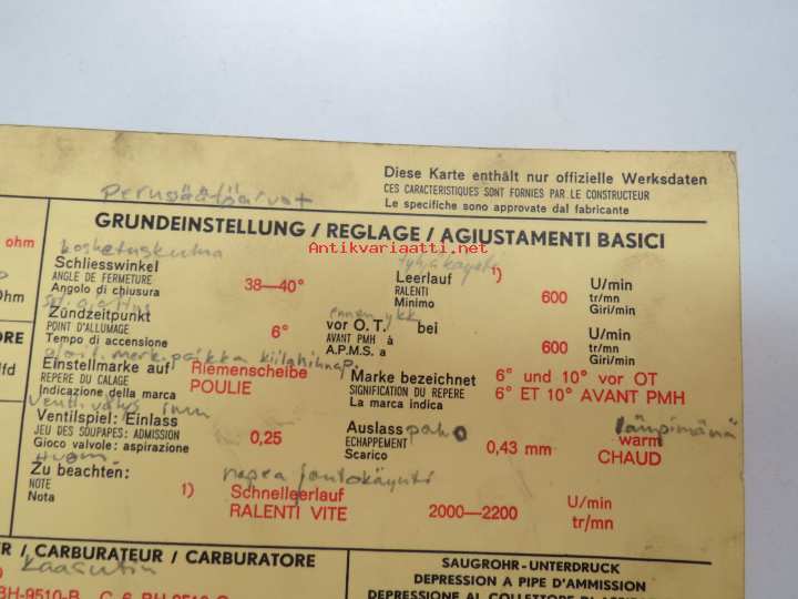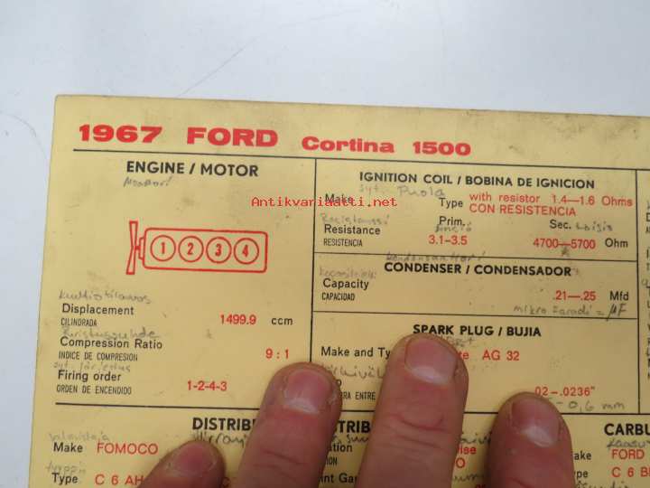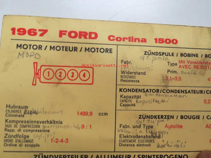 Ford Cortina 1500 1967 Sun Electric Corporation -säätöarvokortti, monikielinen - englanti - espanja - saksa - ranska -Technical specifications
