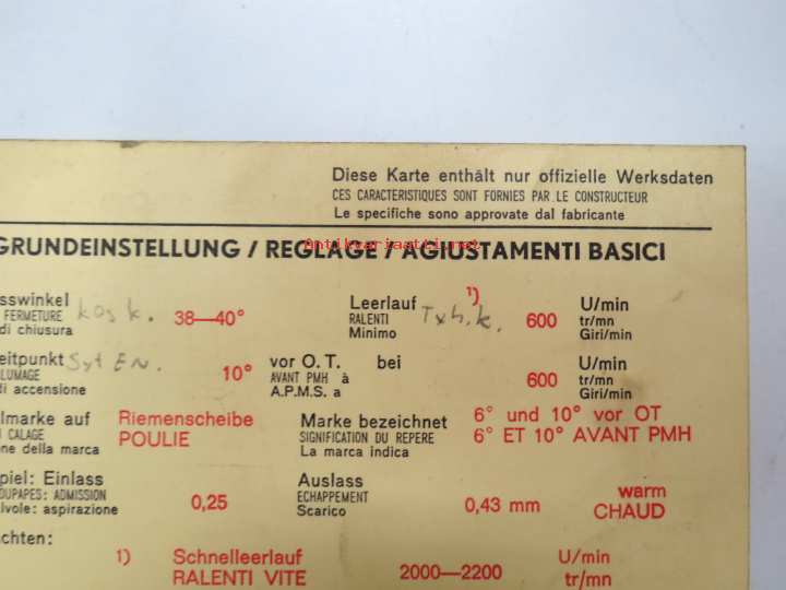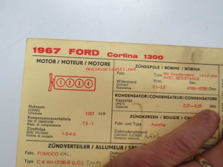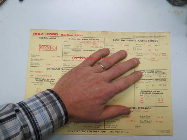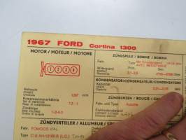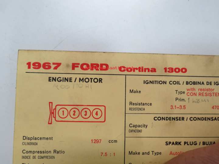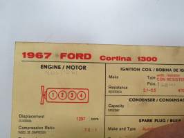 Ford Cortina 1300 1967 Sun Electric Corporation -säätöarvokortti, monikielinen - englanti - espanja - saksa - ranska -Technical specifications