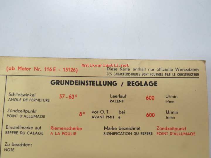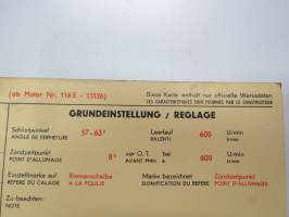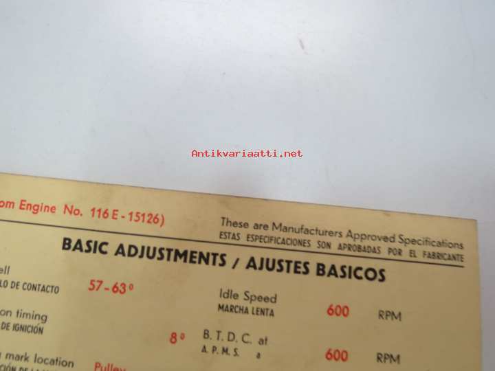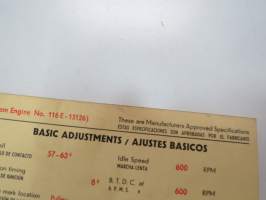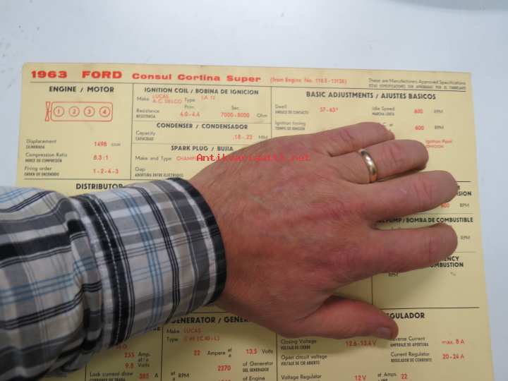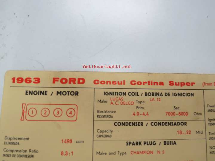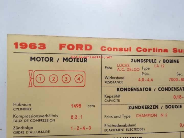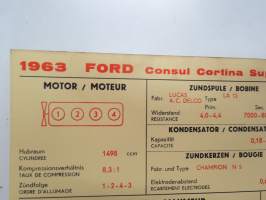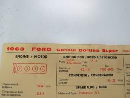 Ford Consul Cortina Super 1963 from eng. nr. 116E-15126 Sun Electric Corporation -säätöarvokortti, monikielinen - englanti - espanja - saksa - ranska -Technical spec
