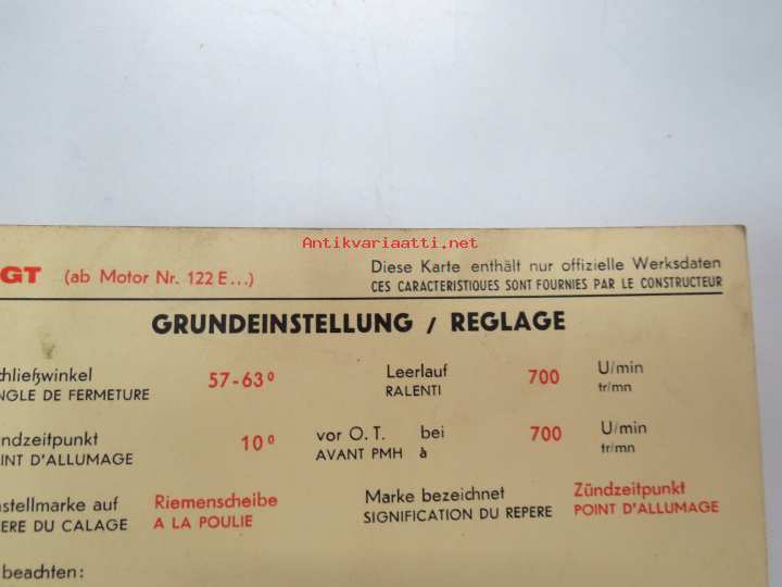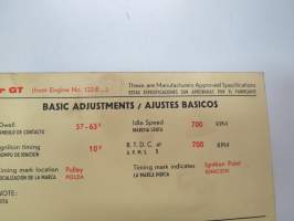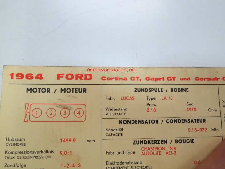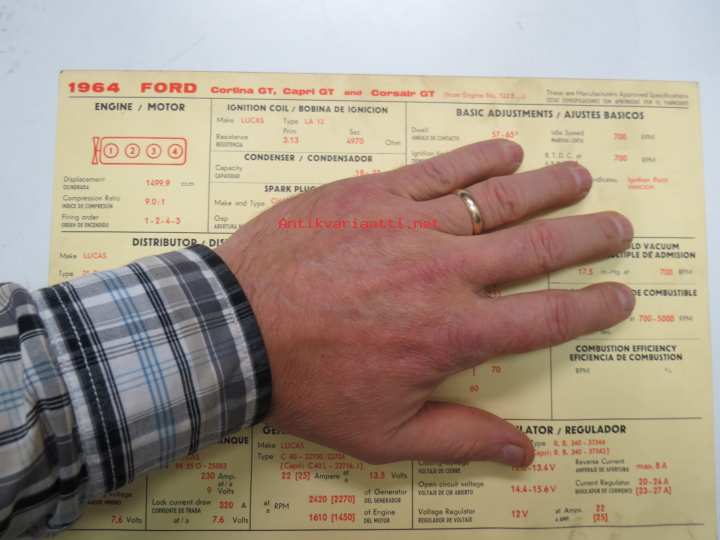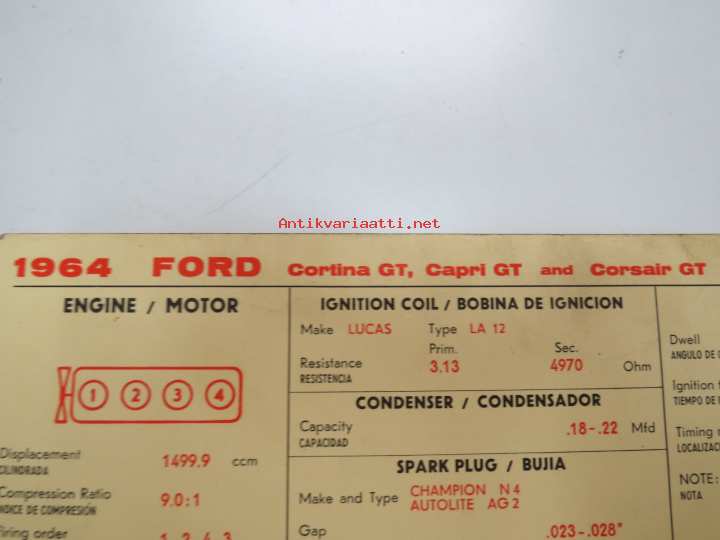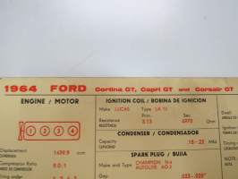 Ford Cortina GT, Capri GT, Corsair GT 1964 from eng. nr. 122E... Sun Electric Corporation -säätöarvokortti, monikielinen - englanti - espanja - saksa - ranska -