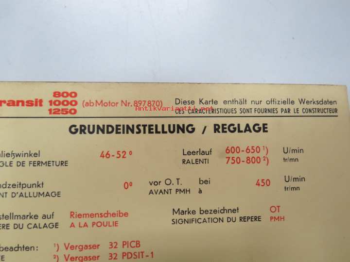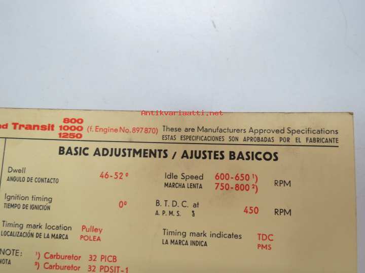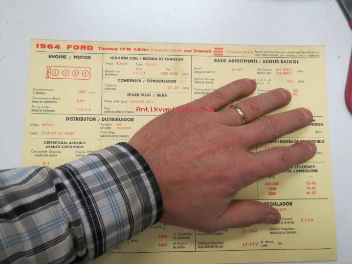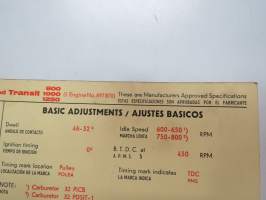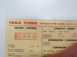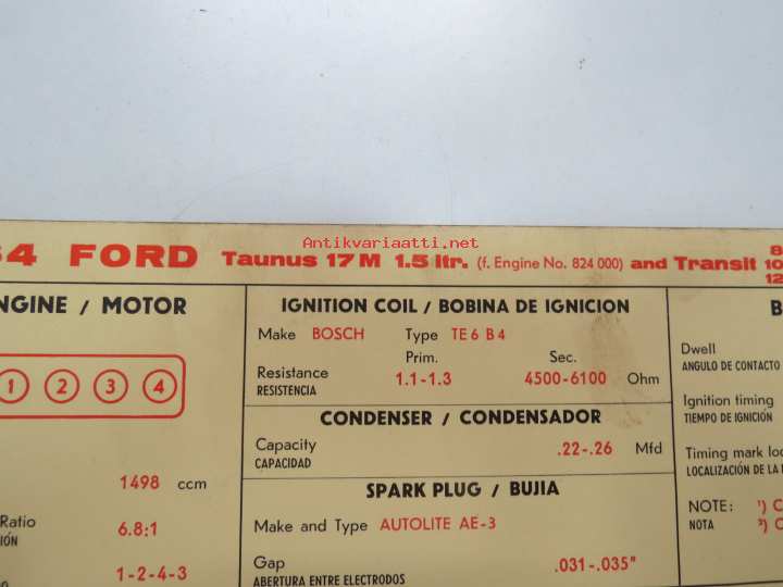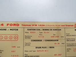 Ford Taunus 17M 1,5 ltr 1964 from eng. nr 824 000, Transit 800, 1000, 1200 from eng. 897870 Sun Electric Corporation -säätöarvokortti, monikielinen -technical specs