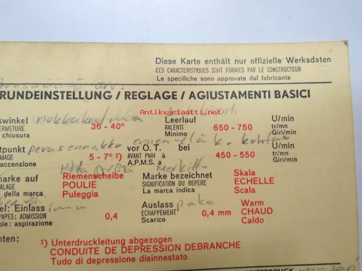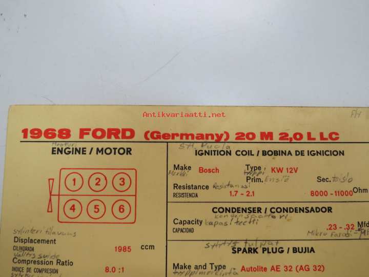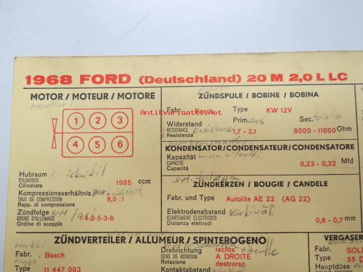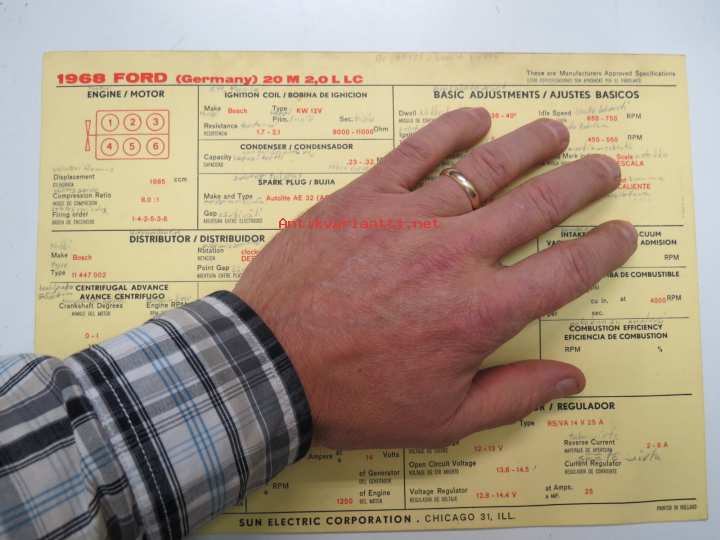 Ford (Germany) 20M 2,0 L LC 1968 Sun Electric Corporation -säätöarvokortti, monikielinen -technical specs