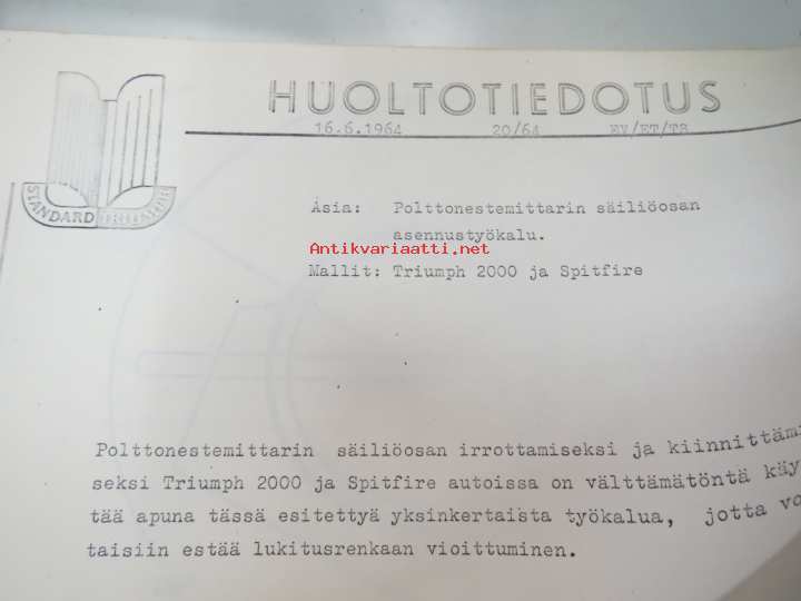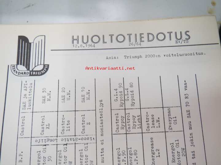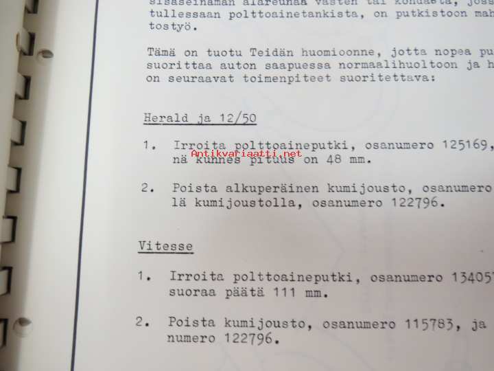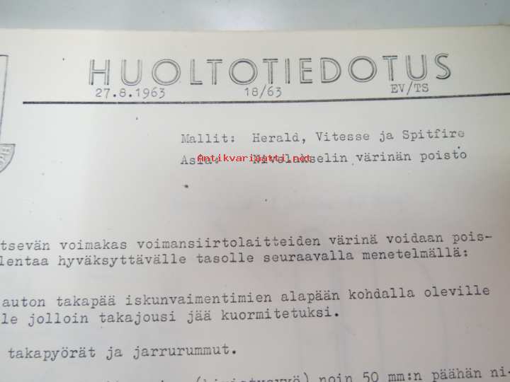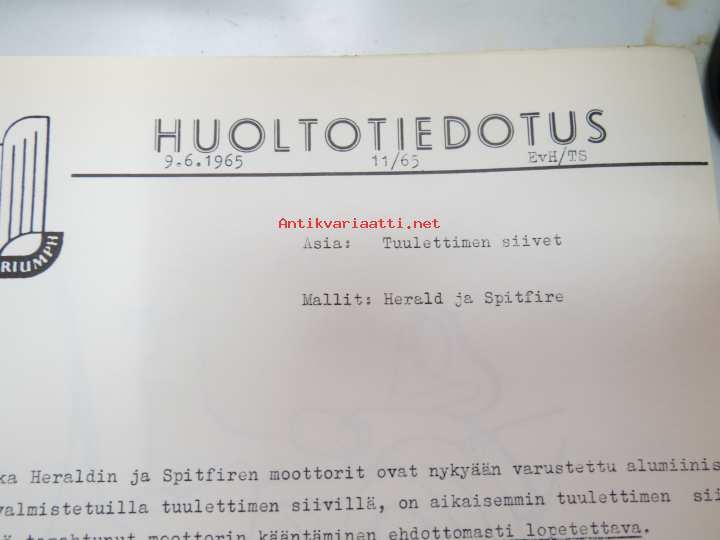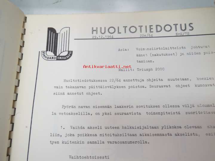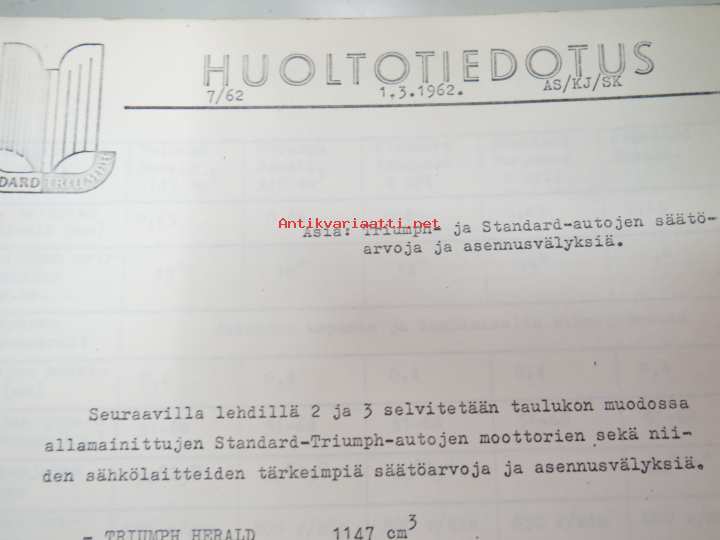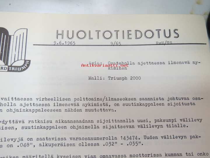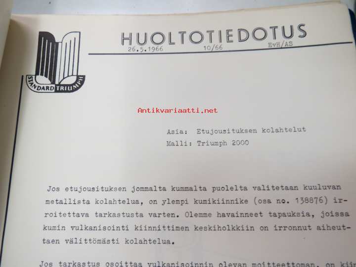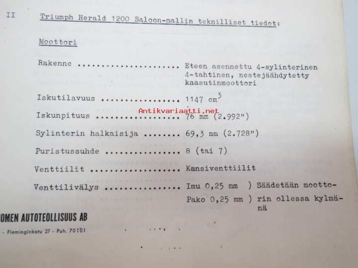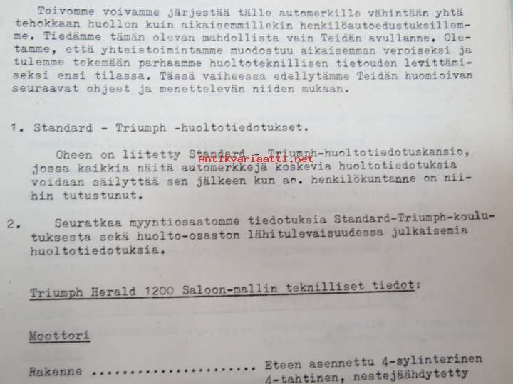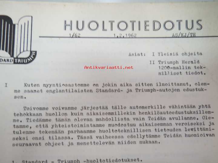 Triumph henkilöautot Herald, Vitesse, Kuriiri, 2000, TR4, Spitfire, ym. - Oy Suomen Autoteollisuus Ab:n tuomien mallien huoltotiedotuksia, tekn tietoja vv. 1962-1966