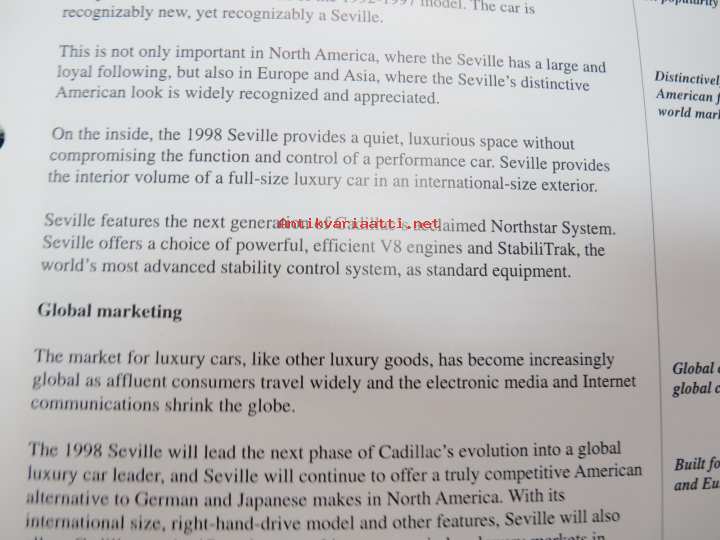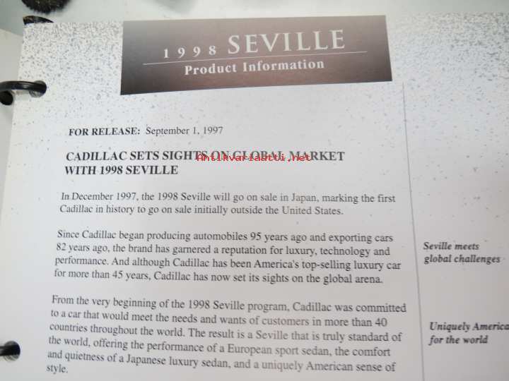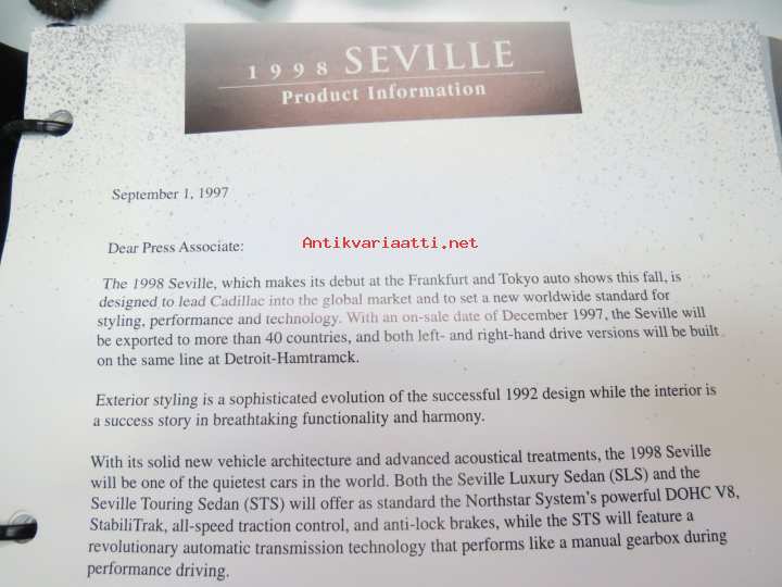 Cadillac Seville 1998 Product / Media Information -kansio, sisältää mm. noin 20 pressikuvaa