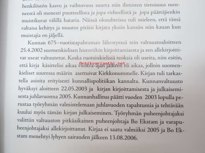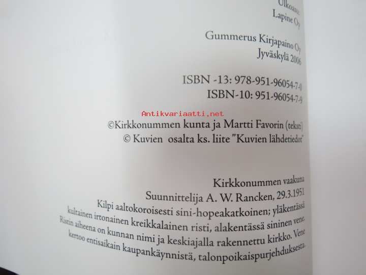 | Saatavilla | 1 kpl | | Julkaisuvuosi | 2006 | | Sivuja | 226 | | Painos | 1. | | Kunto | K3 | | Sidonta/painoasu | Nidottu (pehmeäk.) | | ISBN | 978-951-96054-7-0 | | Kielet | Suomi |