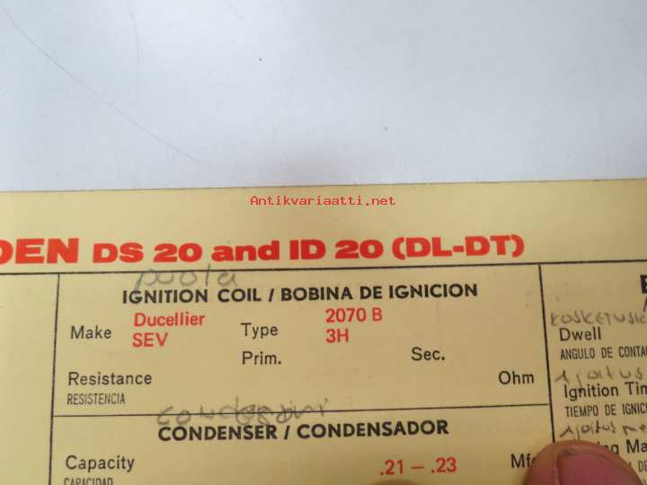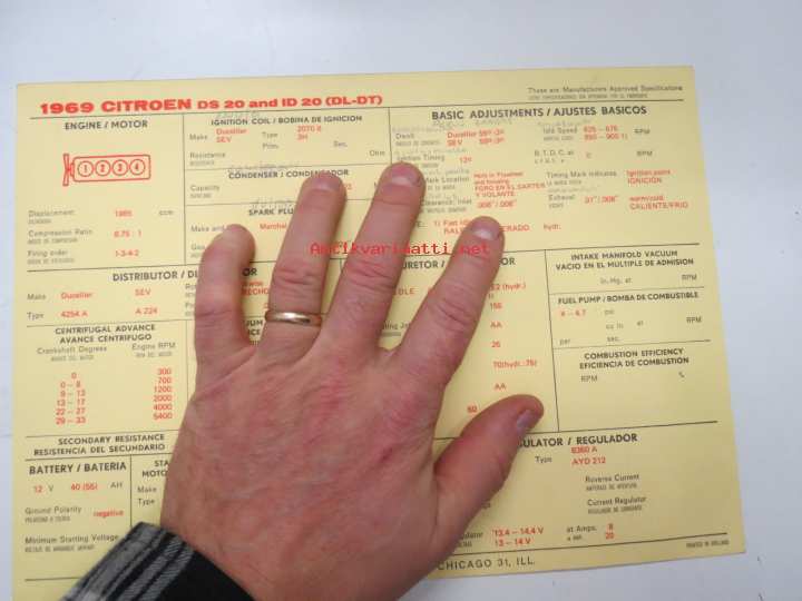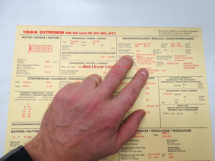 Citroën DS 20, ID 20 (DL-DT) 1969 Sun Electric Corporation -säätöarvokortti, monikielinen -technical specifications, multilingual