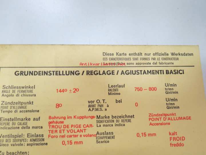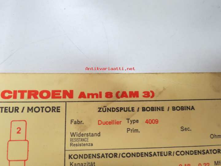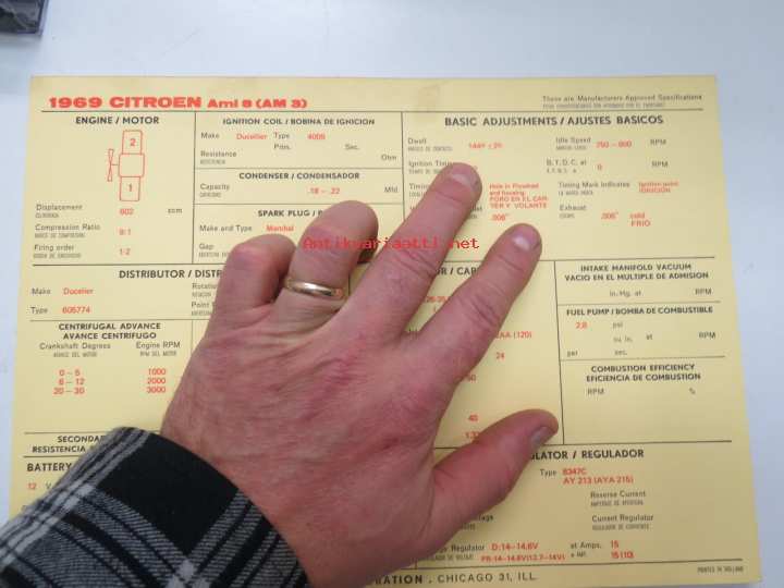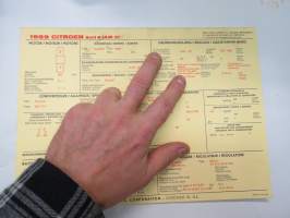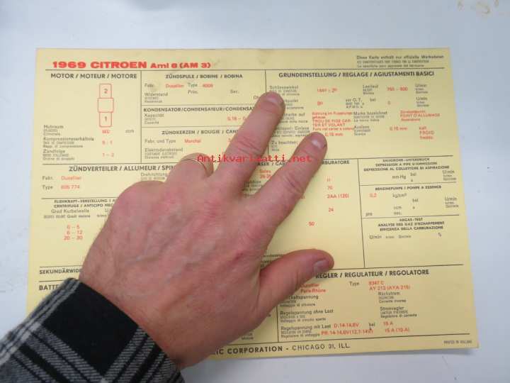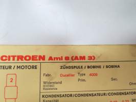 Citroën Ami 8 (AM 3) 1969 Sun Electric Corporation -säätöarvokortti, monikielinen -technical specifications, multilingual