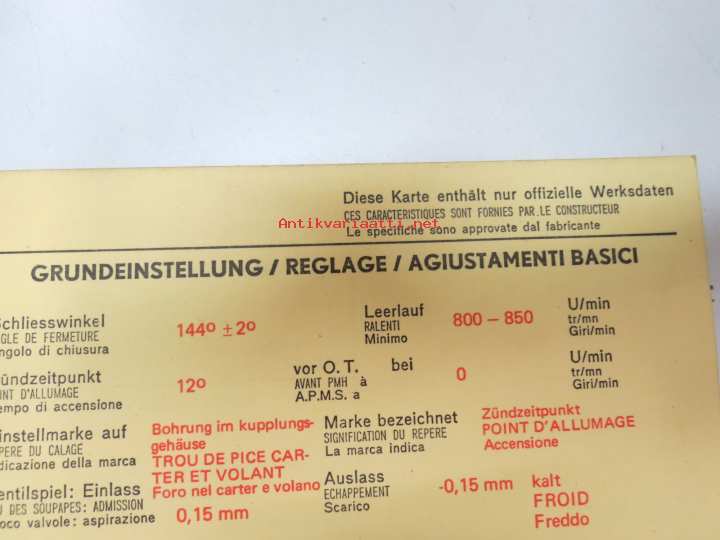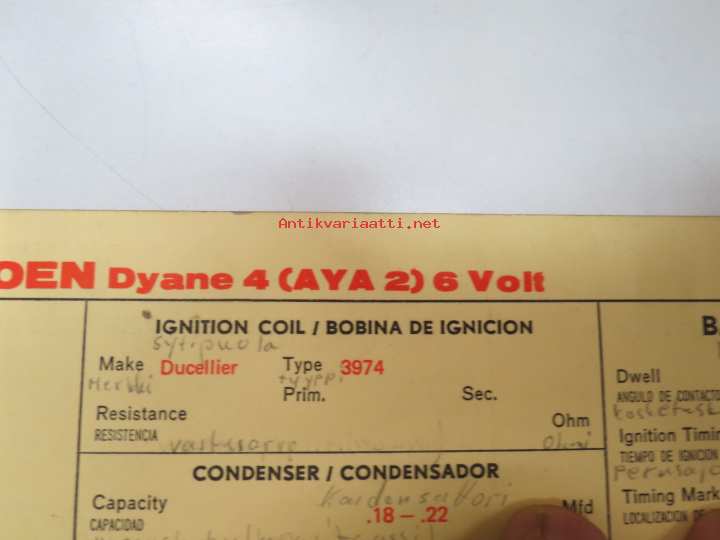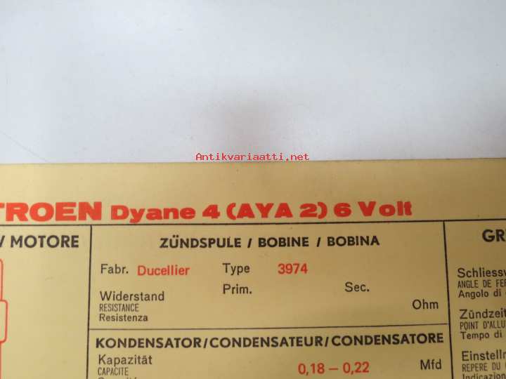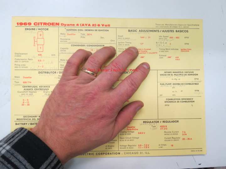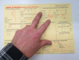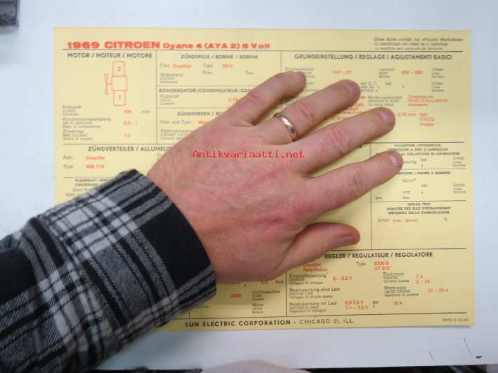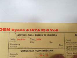 Citroën Dyane 4 (AYA 2) 6 Volt 1969 Sun Electric Corporation -säätöarvokortti, monikielinen -technical specifications, multilingual