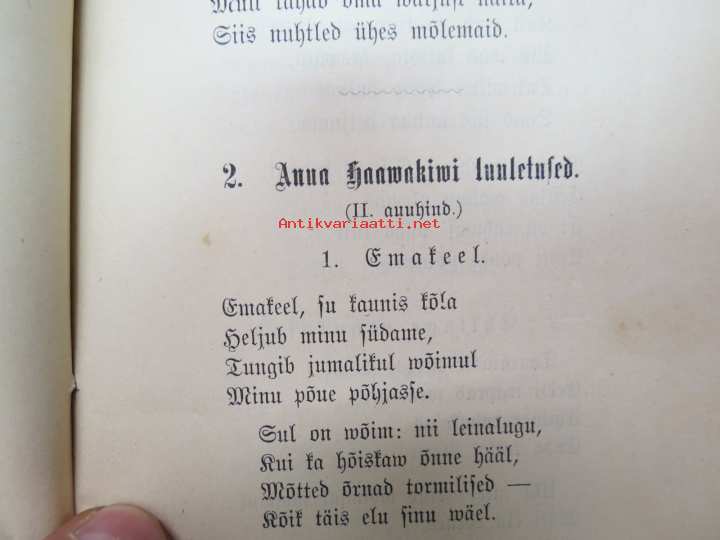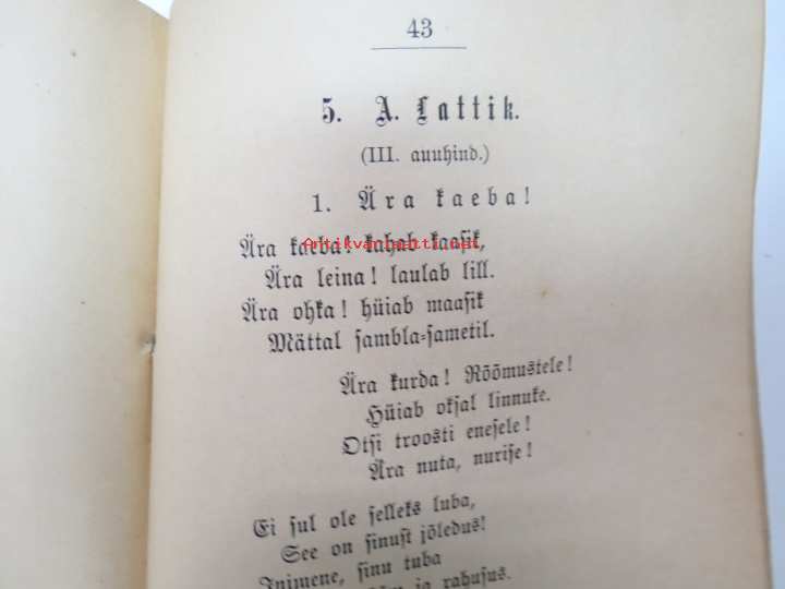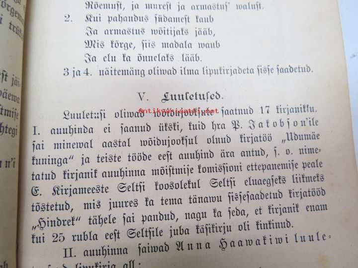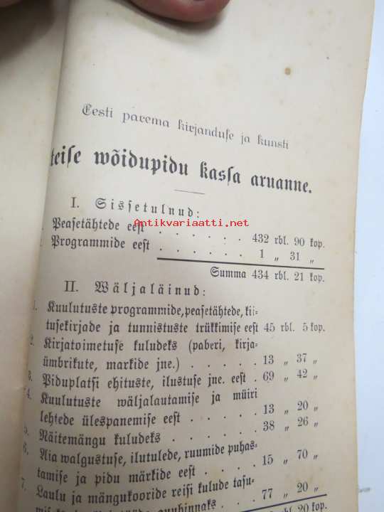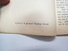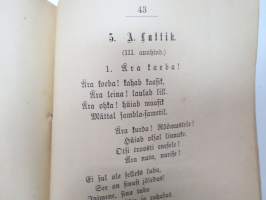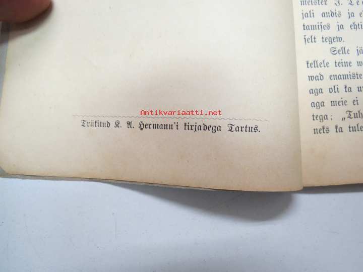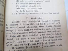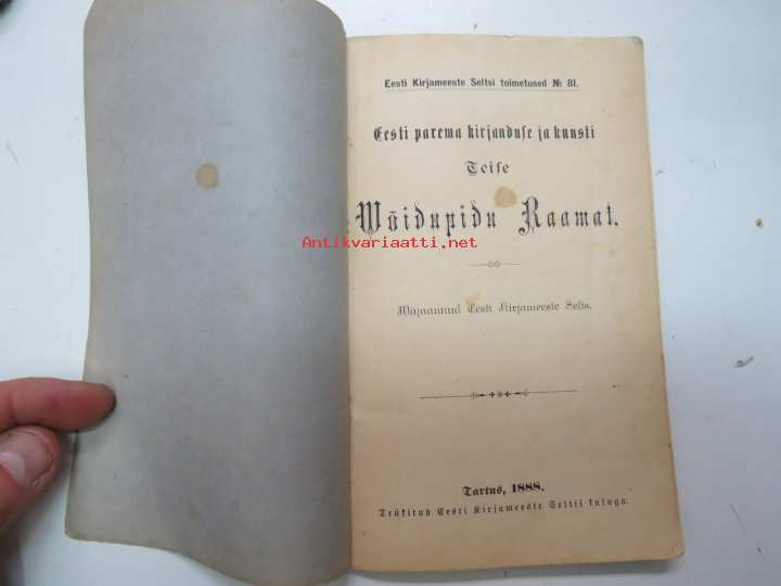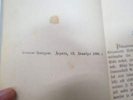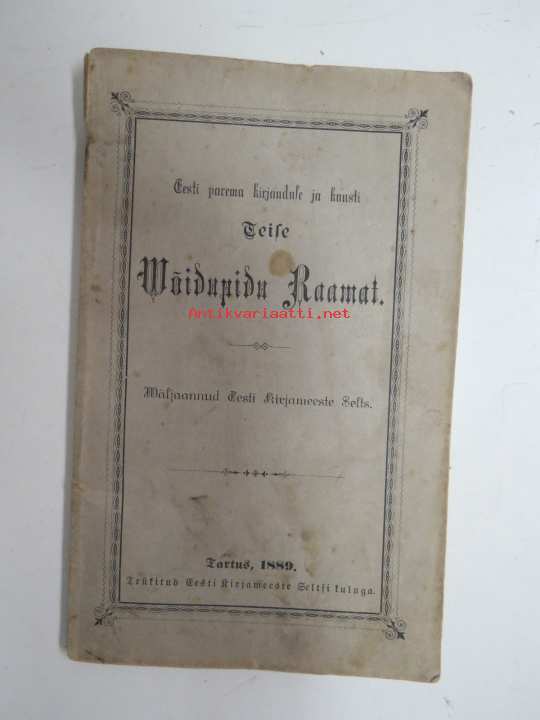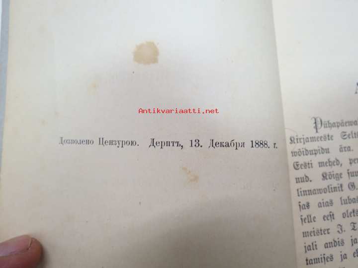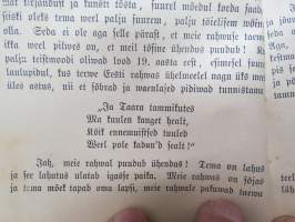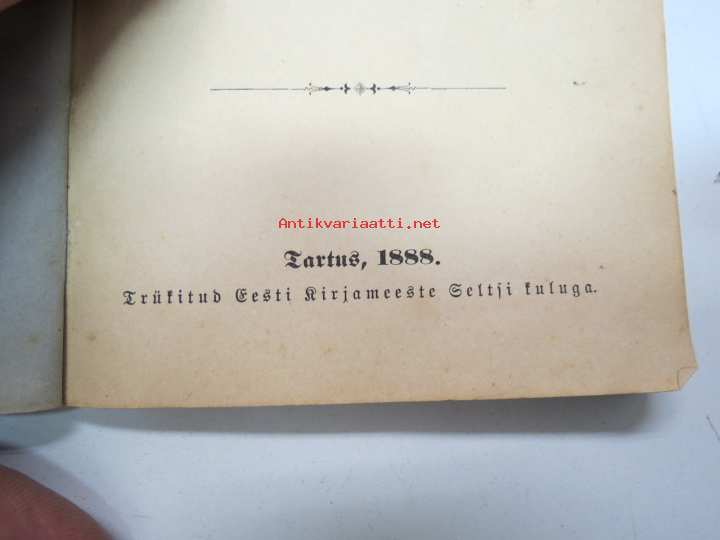 | Saatavilla | 1 kpl | | Julkaisuvuosi | 1889 | | Sivuja | 64 | | Painos | 1. | | Kunto | K2 | | Sidonta/painoasu | Nidottu (pehmeäk.) | | Kielet | Viro |