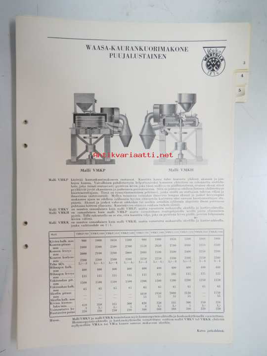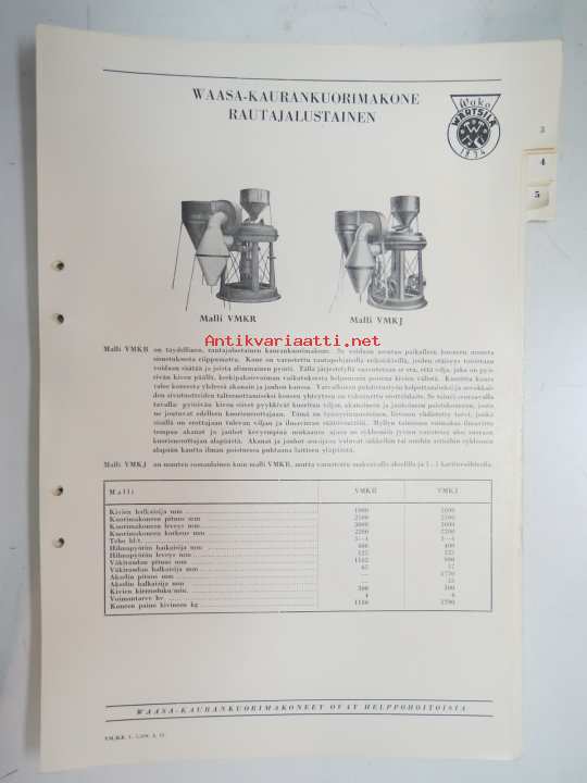 Wärtsilä Peko Waasa-kaurankuorimakone puujalustainen malli VMKP, VMKH, teräsjalustainen malli VMKR, VMKJ -myyntiesite / brochure
