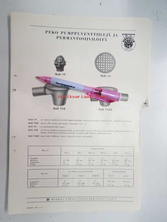 Wärtsilä Peko pumppuventtiilejä ja permantosiivilöitä malli VP, VL, VLK, VLKP -myyntiesite / brochure