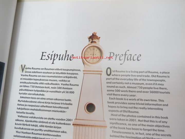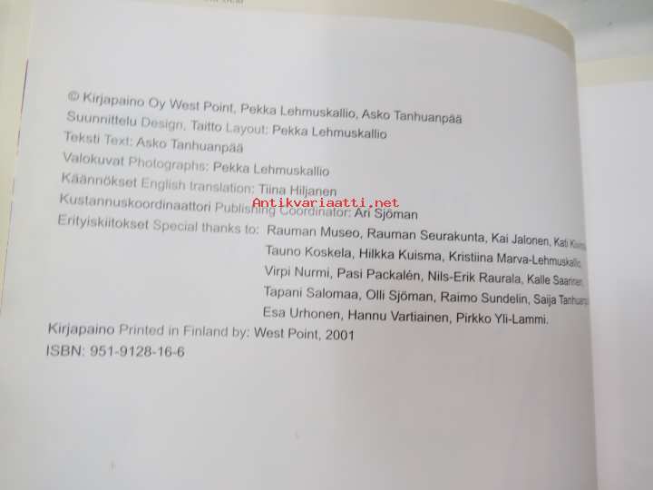 | Saatavilla | 1 kpl | | Julkaisuvuosi | 2001 | | Sivuja | 144 | | Painos | 1. | | Kunto | K3 | | Etusivulla lahjoittajan omiste kirjoitettuna. | | Sidonta/painoasu | Kuvitettu kovakantinen | | ISBN | 951-9128-16-6 | | Kielet | Suomi |