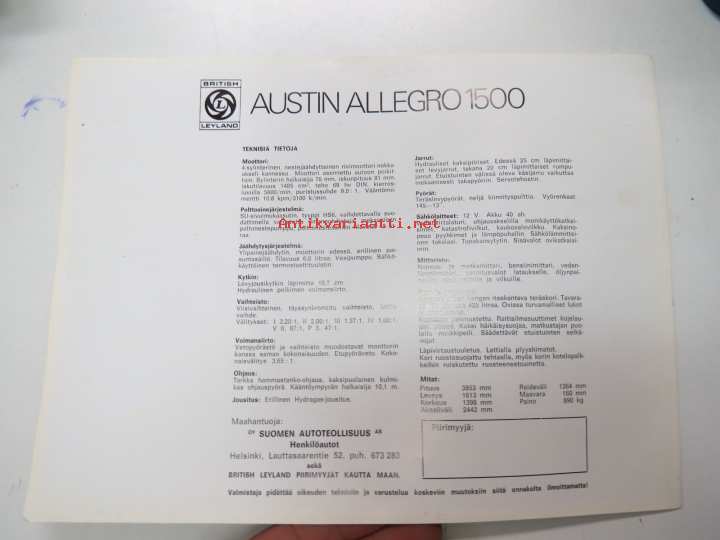 Austin Allegro 1500 4 dr SDL -myyntiesite / sales brochure