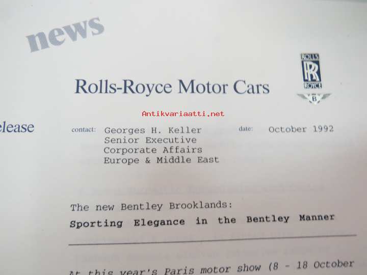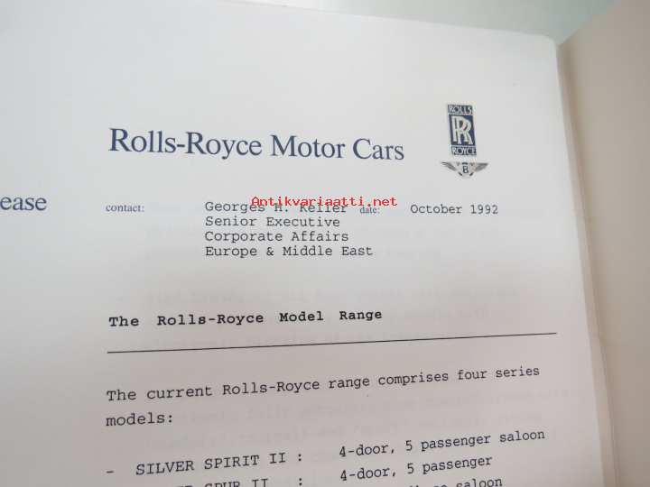 Rolls-Royce Corniche IV news release + 4 pcs press photographs -lanseerausesite + 4 kpl pressikuvia