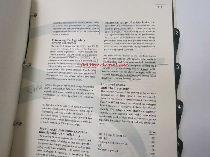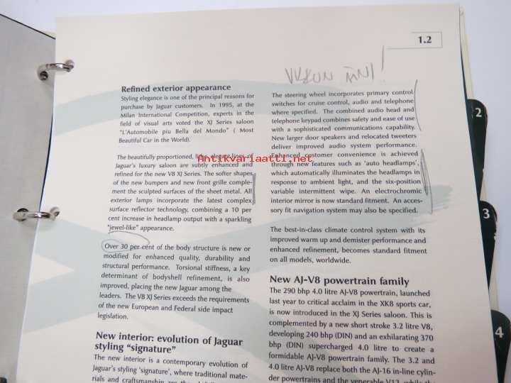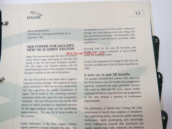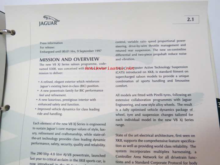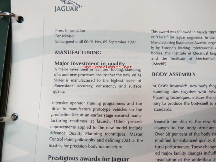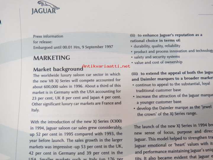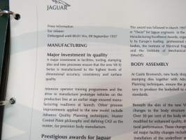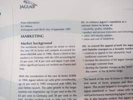 Jaguar XJ Series V8 - Press information 9.9.1997 -pressi- ja lanseerauskansio uudelle mallille, mukana 12 kpl pressikuvia