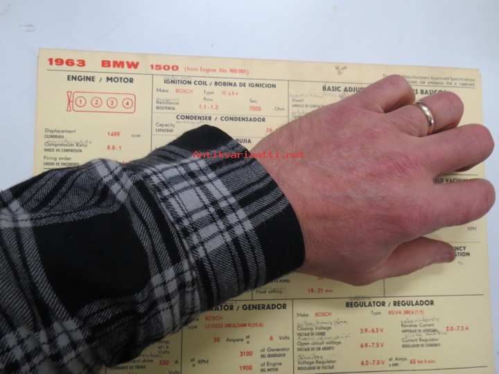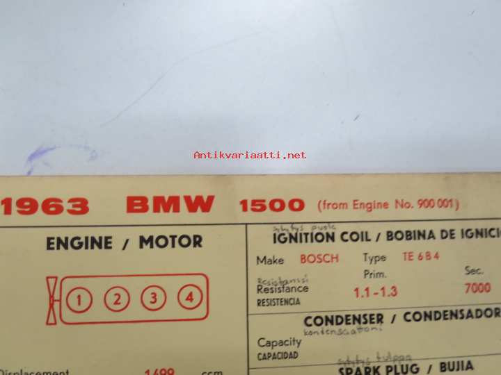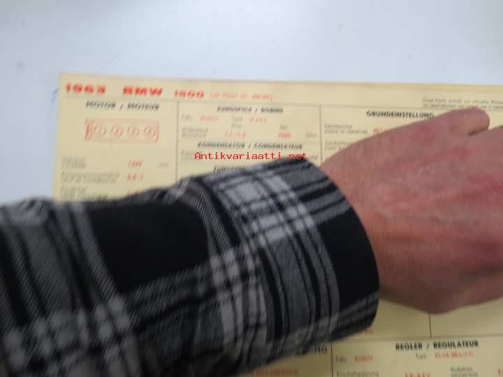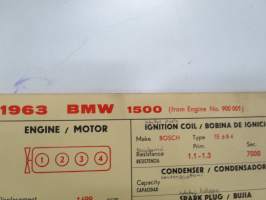 BMW 1500 from engine nr 900 001 1963 Sun Electric Corporation -säätöarvokortti, monikielinen -technical specifications, multilingual